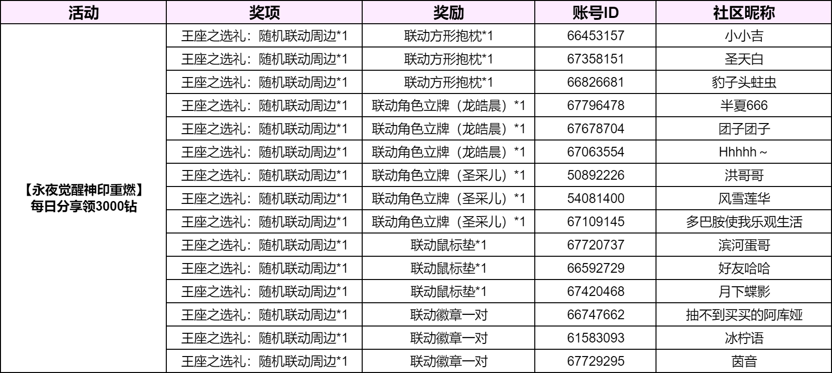 3、王座之选礼:活动结束后,伊莲将在所有参与用户中,随机抽取15位驱夜者送上【随机联动周边*1】!
