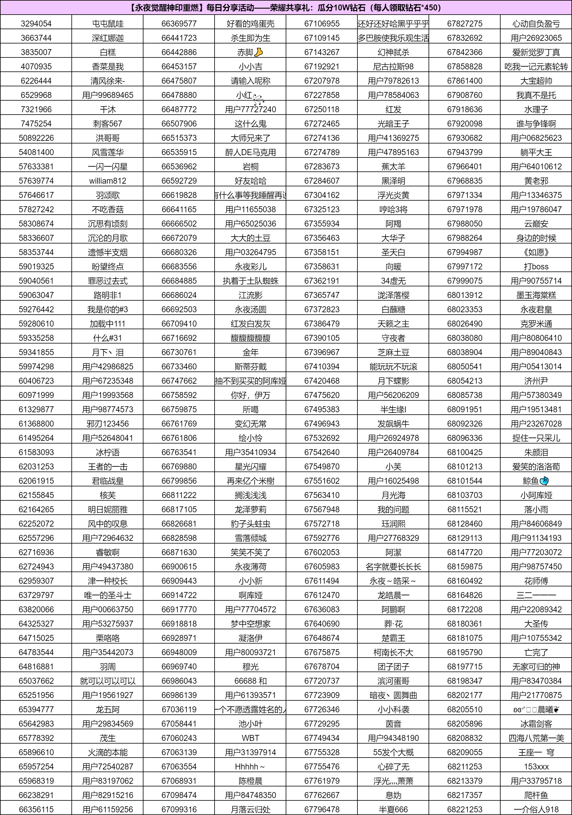 2、荣耀共享礼:活动话题曝光量≥10W,全体参与用户解锁10W钻石瓜分奖池!